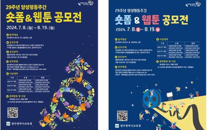 광주시교육청은 오는 8월 19일까지 학생과 교원을 대상으로 ‘양성평등 콘텐츠(숏폼&웹툰) 공모전‘을 개최한다.이번 공모전은 29주년 양성평등주간을 맞아 학교구성원의 양성평등 의식 확산을 위해 마련됐다. 일상, 사회, 미디어, 문화, 환경 등의 성차별 요소, 성별 고정관