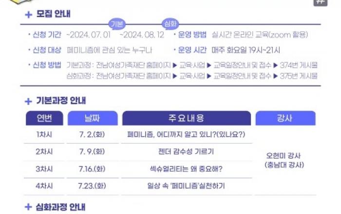 전남여성가족재단은 100% 야간·온라인 교육으로 전남지역 성평등 전문 활동가 발굴 및 역량 강화를 위한 전남페미니즘대학 사업명을 올해부터 ‘여성학실천대학’으로 새롭게 변경하고, 수강생을 모집한다.여성학실천대학은 2019년부터 시작해 전문적이고 지속적인 여성학 전문과정