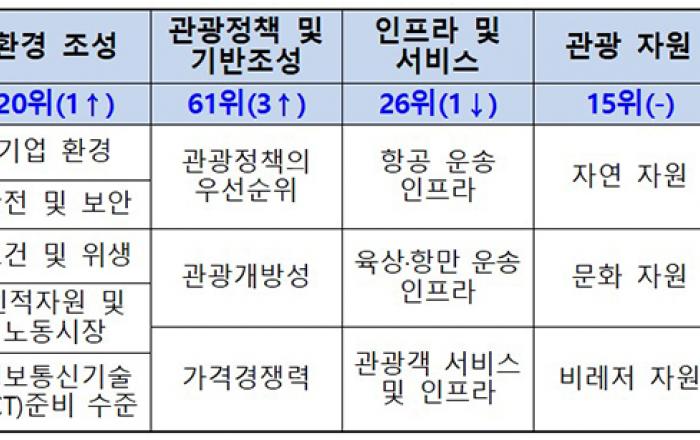 2023년 세계경제포럼(World Economic Forum)의 관광발전지수 평가 결과 우리나라의 종합순위가 119개 평가대상 국가 중 14위를 기록했다. 문화체육관광부는 이번 평가 결과, 우리나라가 아시아 지역에서 일본(3위), 중국(8위), 싱가포르(13위)에 이어