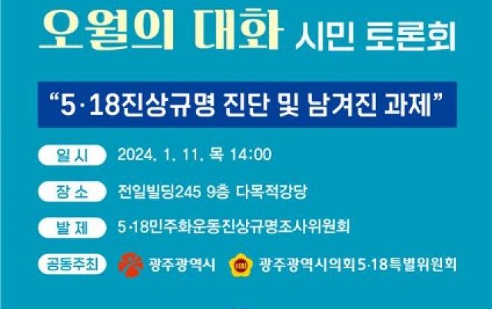 5·18 공론화 프로젝트 ‘오월의 대화’ 제3차 시민토론회가 11일 오후 2시 전일빌딩245 다목적강당에서 열린다.3차 토론회는 5·18 진상규명 상황을 점검하고 향후 대응방안을 모색하기 위해 ‘5·18 진상규명 진단 및 남겨진 과제’를 주제로 진행된다.이번 토론회는