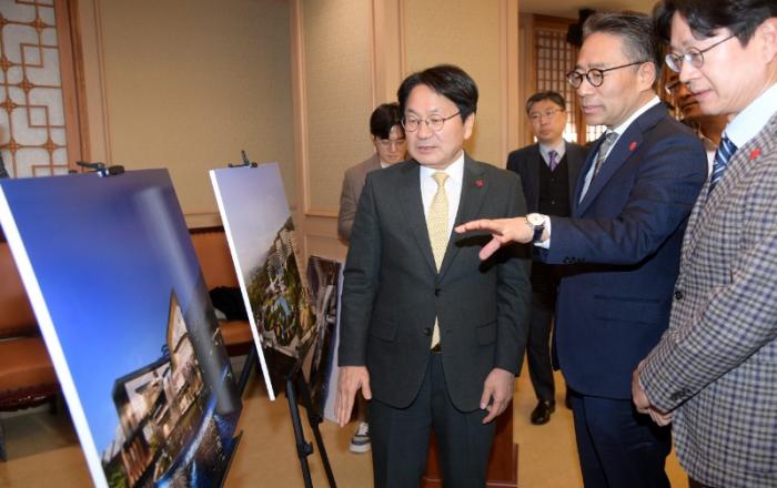 ▲ 강기정 광주광역시장과 임영록 ㈜신세계프라퍼티 사장은 22일 오전 시청 비즈니스룸에서 어등산 관광단지 조성사업 협약을 체결한 후 어등산 관광단지 개발 조감도를 보며 대화하고 있다. / 광주광역시 제공광주지역 18년 간 해묵은 난제였던 어등산관광단지가 본격 개발된다.휴