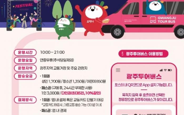 광주광역시(시장 강기정)는 ‘지(G)-페스타 광주’ 가을시즌을 맞아 광주투어버스(관광형 DRT)의 운행을 확대하고 다인패스권을 도입하는 등 관광객 편의를 높여 지역 관광 활성화를 이끈다.‘광주투어버스’는 수요응답형(DRT:Demand Responsive Transpor