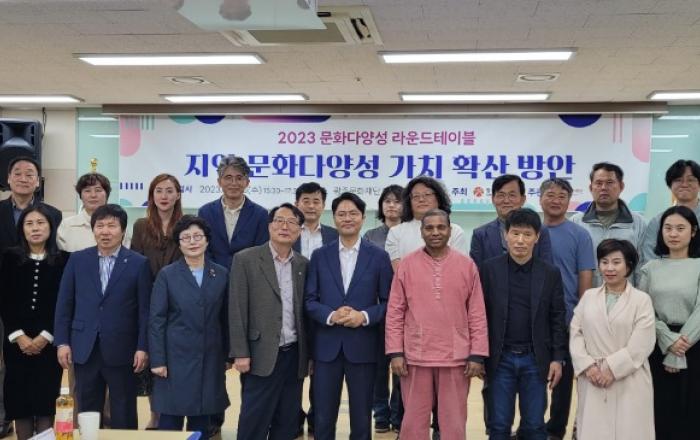 ▲ 김광진 광주광역시문화경제부시장이 25일 광주문화재단에서 열린 ‘2023 문화다양성 원탁회의(라운드테이블)’에 참석해 종합토론을 진행한 뒤 기념촬영을 하고 있다./광주광역시 제공‘포용도시 광주’가 문화다양성의 가치 확산을 도모한다.광주광역시(시장 강기정)와 광주문화재