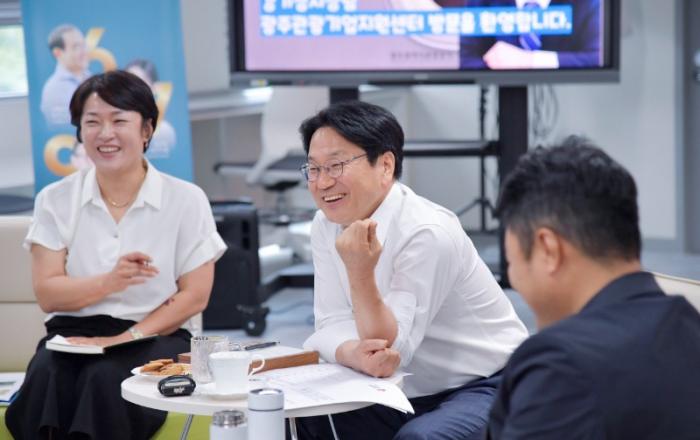 ▲ 강기정 광주광역시장이 13일 오후 서구 관광기업지원센터를 방문해 입주업체 대표, 관광 관련 전문가들과 관광기업 발굴 육성 및 활성화 방안을 논의하고 있다./광주광역시 제공강기정 광주광역시장은 13일 서구 광주관광기업지원센터에서 24번째 정책소풍을 열고 광주 관광기업