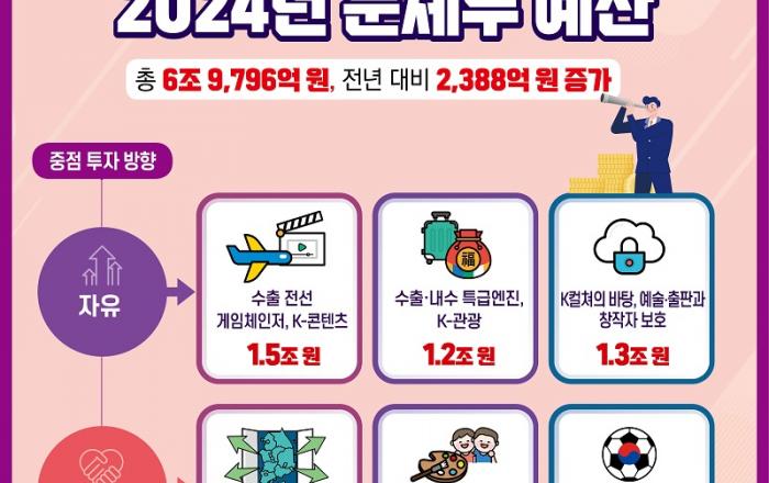 문화체육관광부는 내년 예산안으로 올해보다 3.5% 증액된 6조 9769억 원을 편성했다. 예산 편성 과정에서 보조금을 2442억 원 삭감하고, 절감한 예산은 K콘텐츠와 관광 등 산업활력 제고와 약자 프렌들리 정책 지원에 반영했다. 특히 K-콘텐츠 정책금융을 올해