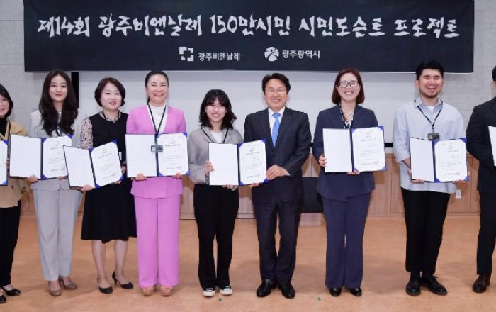 제14회 광주비엔날레 홍보 전도사인 제1호 명예시민도슨트가 탄생했다.광주광역시(시장 강기정)는 27일 오전 시청 무등홀에서 ‘광주비엔날레 찾아오는 교육 과정’ 명예시민도슨트증 전달식을 가졌다.이날 전달식에는 강기정 시장을 비롯해 ‘찾아오는 교육’ 수료자 정나나씨 등 9