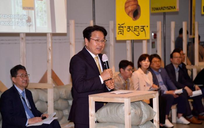 “광주비엔날레가 세계인과 함께 즐기는 문화축제의 장이라면, 연계 전시 프로그램인 파빌리온은 각 나라의 문화대사관입니다. 네덜란드·이탈리아·프랑스 등 총 9개국이 참가하는 역대 최대 규모의 파빌리온에서 역동하는 동시대 미술의 현장을 느끼길 바랍니다.”(강기정 광주광역시장