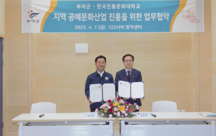 문화재청 한국전통문화대학교는 부여군과 4월 7일 오전 10시 123사비창작센터(충청남도 부여군)에서 청년 공예인을 양성하여 지방소멸 위기를 극복하고 지역 공예 문화산업을 진흥시키기 위한 업무협약을 체결했다. 이번 업무협약은 양 기관이 지난 2018년 11월 28일 문화