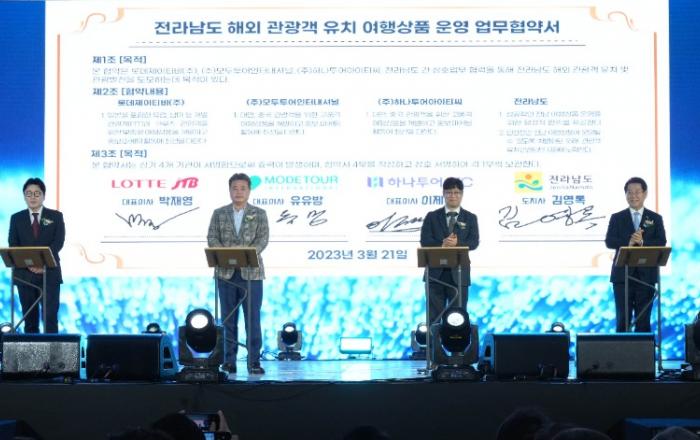 전라남도가 서울 광화문광장에서 개최한 ‘전남 방문의 해 시즌2 서울페스티벌’ 기간 해외에서 국내 여행상품을 판매하는 기업과 업무협약을 통해 해외관광객 300만 명 시대 개막을 위한 힘찬 날갯짓을 시작했다.‘전남도 해외 관광객 유치 여행상품 운영 업무협약’에 참여한 여행