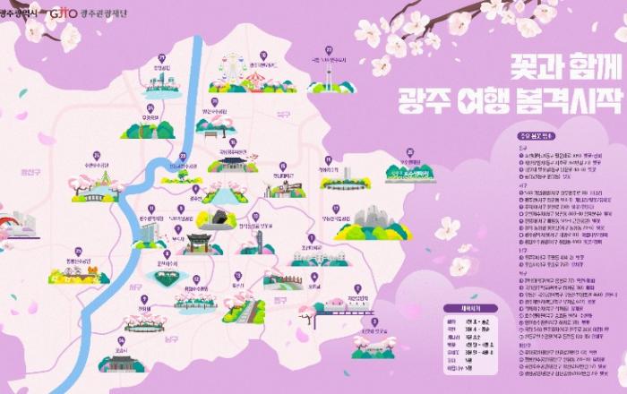 광주시가 지역 봄꽃 명소를 한 눈에 살펴볼 수 있는 ‘봄꽃 지도’를 제작했다.광주광역시(시장 강기정)는 지난 14일부터 21일까지 전국민을 대상으로 실시한 ‘광주 봄꽃 명소 추천 이벤트’를 통해 응모자가 직접 찍은 봄꽃 사진 및 명소를 추천받아 ‘광주 봄꽃 나들이 지도