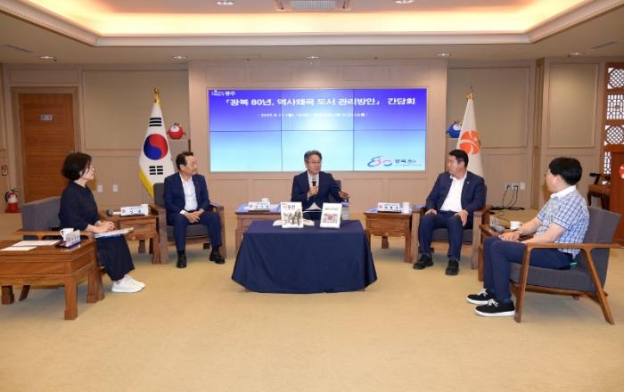 광주광역시(시장 강기정)는 11일 시청 비즈니스룸에서 ‘광복 80년, 역사왜곡 도서 관리방안’ 간담회를 개최했다. 이 자리에는 강기정 시장을 비롯해 이정선 광주시교육감, 임택 구청장협의회장(동구청장), 문수영 흥사단 청소년활동진흥센터장 등이 참석했다. 이날 간담회는 최