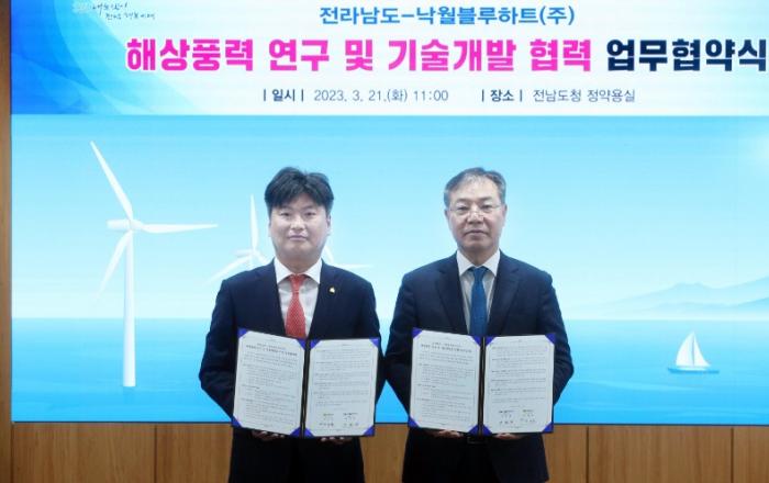 전라남도는 국내 첫 대규모 해상풍력단지로 조성 중인 영광 낙월 해상풍력단지에서 산업 발전의 밑거름이 될 연구 및 기술 개발을 위해 21일 도청 정약용실에서 낙월블루하트(주)와 업무협약을 했다.이날 협약식에는 박창환 전남도 정무부지사, 강현재 낙월블루하트(주) 대표이사,