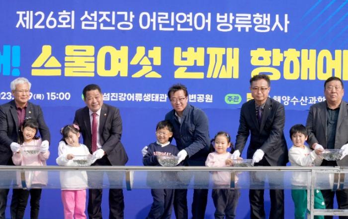 전라남도해양수산과학원은 9일 구례 간전면 섬진강 동방천에서 어족자원 보호와 연구 활용을 위한 어린 연어 방류행사를 개최했다.올해로 26번째를 맞는 이날 행사에는 구례군 유관기관, 지역 주민, 초중학생 등 300여 명이 참석해 어린 연어 50만 마리를 방류하고 긴 여정의