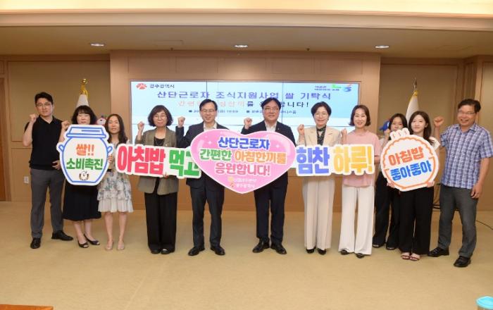 광주광역시(시장 강기정)는 농협중앙회 광주지역본부가 산단 근로자들의 조식 지원을 위해 쌀 20㎏ 100포대(총 2t)를 기탁했다고 11일 밝혔다.이날 시청 비즈니스룸에서 열린 기탁식에는 고광완 행정부시장과 이현호 농협 광주총괄본부장이 참석해 상생 협력의 뜻을 나눴다.농