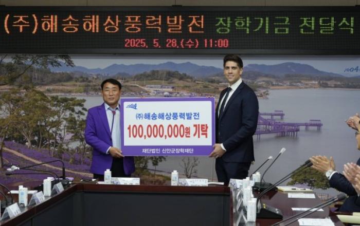 글로벌 그린에너지 투자개발사 CIP(코펜하겐 인프라스트럭쳐 파트너스)의 신안 해상풍력 프로젝트 법인인 해송해상풍력발전이 지난 28일 신안군청에서 신안군장학재단과 장학금 기탁을 위한 약정을 체결했다.해송해상풍력발전은 지역사회와의 상생을 실현하고자 신안군장학재단에 장학금을