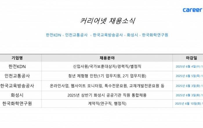 취업 포털 커리어가 한전KDN, 인천교통공사, 한국교육방송공사, 화성시, 한국화학연구원 채용 소식을 30일 발표했다.한전KDN에서 2025년 신입사원/국가보훈대상자/경력직/별정직 채용을 진행한다. 채용 분야는 신입직원에서 △전산 △통신 △전기 △정보보호 △사무일반 △건