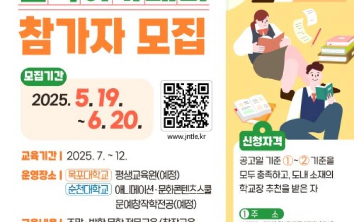 전라남도와 전남인재평생교육진흥원은 문학에 재능이 있는 고등학생을 발굴·육성하기 위한 ‘2025 청소년 문학아카데미’를 운영키로 하고, 6월 20일까지 참가자를 모집한다고 밝혔다.청소년 문학아카데미는 전문 문학교육과 체험활동이 연계된 창작 중심 교육 프로그램이다. 전남도