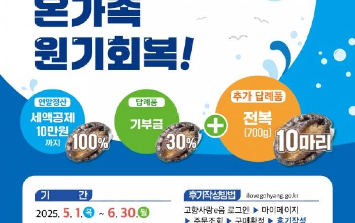 전라남도가 가정의 달을 맞아 6월 30일까지 두 달간 고향사랑기부제 답례품 후기를 작성하면 전남산 전복을 추가로 제공하는 이벤트를 한다.더운 낮 기온으로 떨어지는 기운을 회복할 보양식으로 더할 나위 없는 ‘전복 700g(10마리)’을 추가 답례품으로 제공하는 이벤트다.