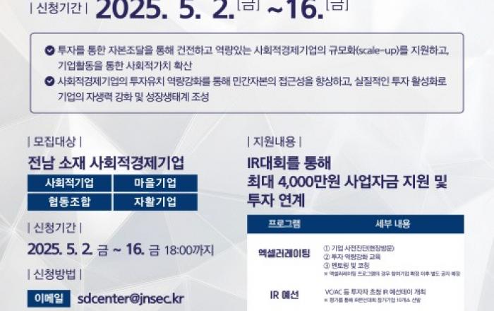 전라남도는 유망 사회적경제기업을 선정해 민간투자를 유치할 역량을 키우는 ‘2025년 사회적경제 시장확대 역량강화 지원사업’을 1억 4천만 원 규모로 추진한다고 밝혔다.올해는 사업비를 지난해보다 3천만 원 확대하고, 프로그램도 단순 교육 중심에서 벗어나 실전형 투자유치