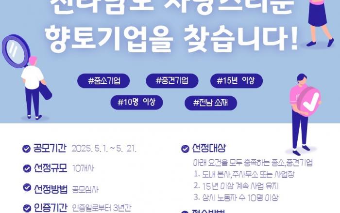 전라남도는 지역경제 활성화와 일자리 창출에 기여하고, 지역사회와 함께 성장한 향토기업을 발굴·육성하기 위해 ‘2025년 전라남도 자랑스러운 향토기업’을 오는 21일까지 3주간 모집한다고 밝혔다.자랑스러운 향토기업 인증 제도는 ‘전라남도 향토기업 육성 및 지원에 관한 조