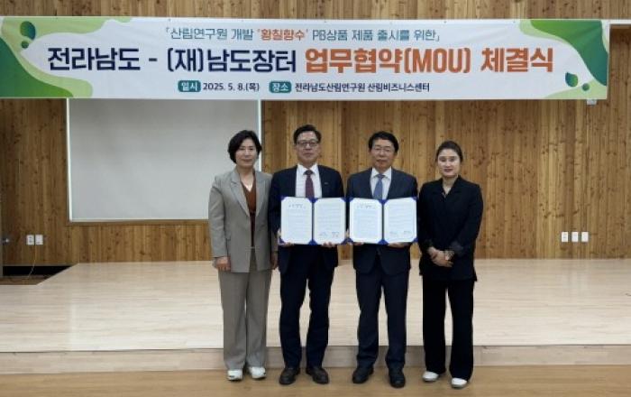 전라남도산림연구원은 8일 재단법인 남도장터와 업무협약을 해 자체 개발한 황칠향수, 생달디퓨져 등 우수 연구성과물을 제품으로 직접 출시키로 했다.협약은 전남도산림연구원과 남도장터가 보유한 자원과 역량을 상호 공유하고 협력해 산림바이오산업 발전과 도민 산림복지 향상을 도모