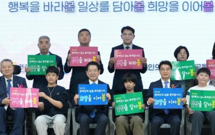 전라남도는 21일 영광스포티움 국민체육센터에서 ‘제45회 장애인의 날’ 기념행사를 열어 장애인의 권익증진과 사회통합에 대한 인식을 함께 나눴다.전남도와 영광군이 공동 주최하고, 전남장애인의 날 공동추진위원회(지체·시각·농아)가 주관한 기념식에는 김영록 전남도지사, 김태