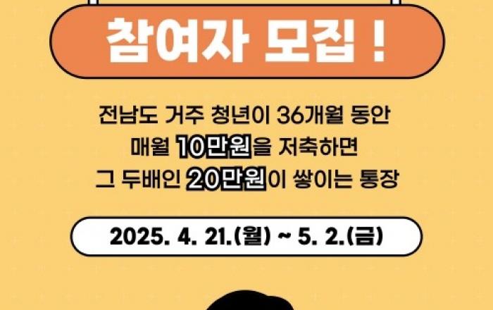 전라남도는 오는 5월 2일까지 ‘2025년 청년 희망디딤돌 통장’ 사업의 신규 참여자를 모집하고, 적격심사를 거쳐 7월 총 825명을 최종 선정할 계획이라고 밝혔다.청년 희망디딤돌 통장은 청년이 지역에서 안정적으로 미래를 설계하도록 전남도와 청년이 함께 통장을 개설하고