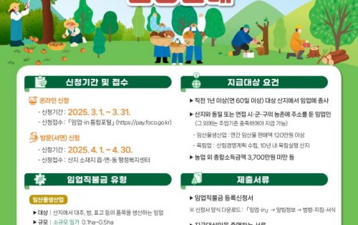 서부지방산림청은 2025년 임업?산림 공익직접지불금(이하 ‘임업직불금’) 신청?접수를 이번 달 31일까지 진행한다고 밝혔다.온라인을 통한 임업직불금 신청.접수는 지난 3월 31일에 완료되었으며, 4월 1일부터 4월 30일까지는 지급 대상 임업인들이 산지가 소재한 읍.면