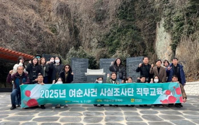전라남도는 오는 8월까지 여순사건 현장 사실조사 100% 완료를 목표로 조사원 역량 강화를 위해 7일까지 이틀간 2025년 상반기 여순사건 사실조사단 직무교육을 했다.교육엔 전남도와 22개 시군 업무담당 공무원과 사실조사요원 등을 포함한 총 74명이 참석했다. 여순사건