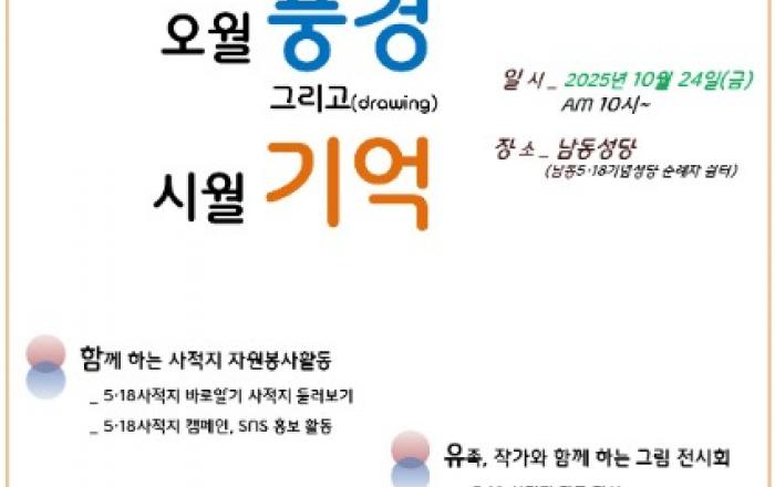 광주광역시(시장 강기정)는 5·18민주유공자유족회와 함께 24일 동구 남동5·18기념성당에서 시민과 함께하는 ‘오월 풍경 그리고(drawing) 시월 기억’ 전시회를 개최한다.이 전시회는 5·18민주화운동의 정신을 계승하고 시민들의 역사 인식을 높이기 위한 ‘5·18유