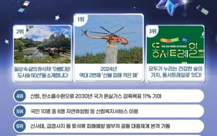 산림청은 갑진년(甲辰年)을 보내며 ‘2024년 산림청 10대 뉴스’를 선정해 26일 발표했다. 10대 뉴스는 올 한해 산림청과 관련된 관심 뉴스를 대상으로 국민, 언론인, 산림청 직원들의 투표(12.18~12.20)를 거쳐 선정되었다.올해 가장 관심을 끈 뉴스는 ‘20