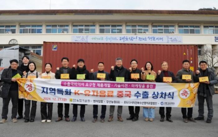 전라남도농업기술원은 유자음료를 직접 개발하고 지역업체에 기술이전한 결과 3종 총 30만 병(1억 8천480만 원 상당)의 유자음료가 지난 27일 중국 수출길에 올랐다고 밝혔다.수출 유자음료는 전남지역 특산물인 유자, 녹차, 비파와 함께 해삼, 홍합, 굴에서 추출한 펩타