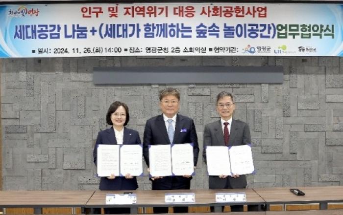 한국토지주택공사(LH)는 26일 영광군청 소회의실에서 영광군, 한국해비타트와 「세대공감 나눔+」 사업 추진을 위한 업무협약을 체결했다고 밝혔다.「세대공감 나눔+」란 LH가 지자체, 한국해비타트와 함께 비수도권 인구 및 지방소멸 위기에 대응하고 활력을 부여하고자 올해 처