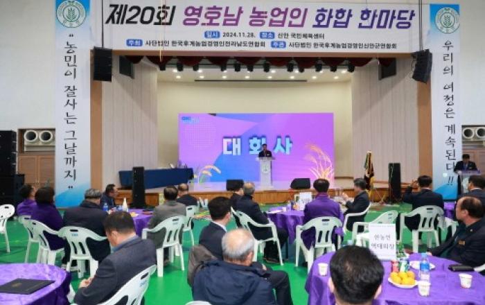 전라남도는 29일까지 이틀간 신안 국민체육센터에서 영호남 농업인이 한데 모여 농업 상생발전과 화합을 다지는 ‘제20회 영호남 농업인 화합한마당’ 행사가 열렸다고 밝혔다.‘농민이 잘사는 그날까지 우리의 여정은 계속된다!!’라는 주제로 개최된 이번 행사에선 영호남 농업경영