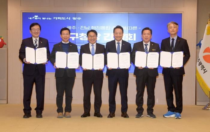 광주시가 광주전남 행정통합의 성공적 추진을 위해 5개 자치구와 현장 중심의 협력 체계를 강화한다.광주광역시(시장 강기정)는 13일 시청 비즈니스룸에서 ‘광주전남 행정통합 5개 자치구 구청장 간담회’를 열어 추진 현황을 공유하고 협력 방안을 담은 공동선언문을 발표했다.이