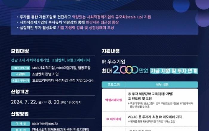 전라남도가 사회적경제 가치를 확산하고, 경쟁력을 높이기 위한 ‘2024년 사회적경제 투자유치 역량강화·시장진출 지원사업’ 참여 기업을 오는 8월 20일까지 모집한다고 밝혔다.영세하지만 발전 잠재력이 큰 전남 사회적경제의 도약과 성장의 디딤돌을 마련하는 이번 사업에는