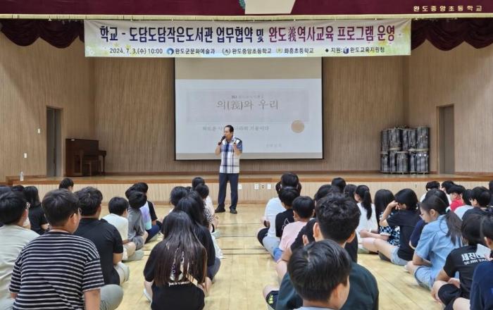 완도중앙초등학교는 7월 3일에 도담도담작은도서관에서 완도군 문화예술과, 완도군청 문화예술과 도서관팀, 완도교육지원청 관계자, 학부모가 참석한 가운데, ‘완도독서인문교육 활성화를 위한 완도중앙초-도담도담작은도서관 업무협약’을 체결했다. 이번 업무협약은 완도 지역의