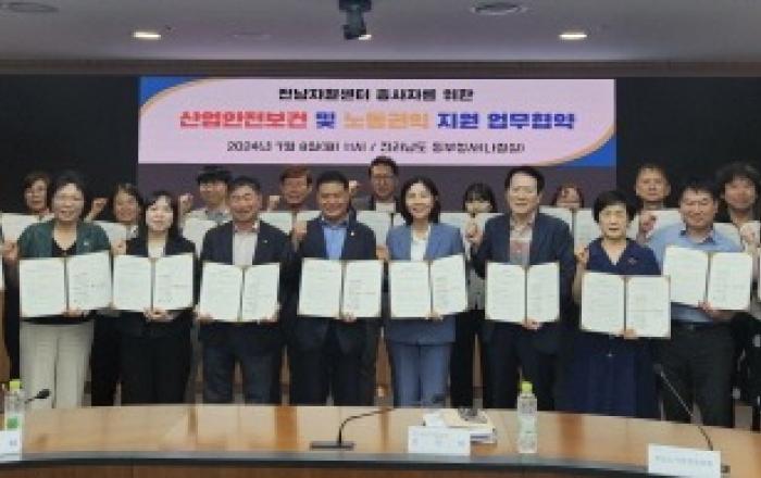 전라남도노사민정협의회는 8일 전남도 동부청사에서 지역자활센터 취약 노동자 노동권익 증진을 위한 ‘산업안전보건지원 업무협약’을 했다.전남노동권익센터 주관으로 협약식에는 오수미 전남도 중소벤처기업과장, 주종섭 전남도의회 의원, 문길주 전남노동권익센터장, 자활센터 대표자와