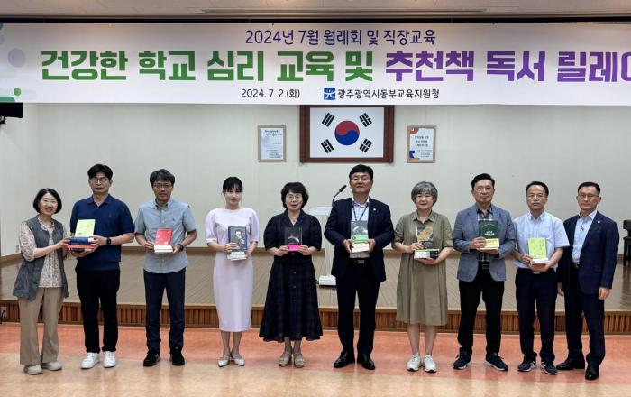 광주동부교육지원청이 2일 월례회에서 시교육청 역점사업인 ‘다시, 책으로’ 프로젝트의 실천을 위해 ‘추천책 독서 릴레이’를 실시했다.동부교육지원청에 따르면, 이번 독서릴레이 첫 번째 책으로는 정성숙 교육장이 추천한 윤우상 작가의 ‘강강술래학교’이다. ‘강강술래학교’는 초
