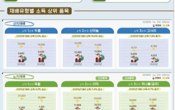 산림청은 단기소득임산물 15개 품목을 대상으로 2023년 임산물소득조사*를 실시한 결과, 지난해 산지에서 재배하는 산나물 중 1ha 당 소득이 가장 높은 품목은 두릅(13,259천 원/ha)으로 조사되었다고 19일 밝혔다. 산지 재배 품목 중 두릅