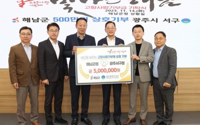 해남군과 광주시 서구는 고향사랑기부제 활성화를 위해 십시일반 모은 고향사랑기부금 500만원을 상호지역에 기부했다. 지난 14일 해남군청에서 진행된 상호기부식은 명현관 해남군수와 송민철 서구 자치행정국장 등 관계자들이 참석한 가운데 진행됐다. 참석자들은 고향사랑기