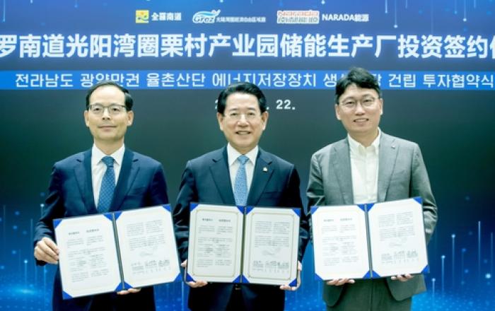 김영록 전라남도지사가 22일 중국 에너지저장장치(ESS) 시장 점유율 1위 기업인 나라다사와 5천만 달러(약 600억 원) 규모의 투자협약을 해 전남이 이차전지 등 산업 분야 세계 중심지로 우뚝 설 기반을 마련했다. 중국을 방문 중인 김영록 지사는 이날 오전 상하이