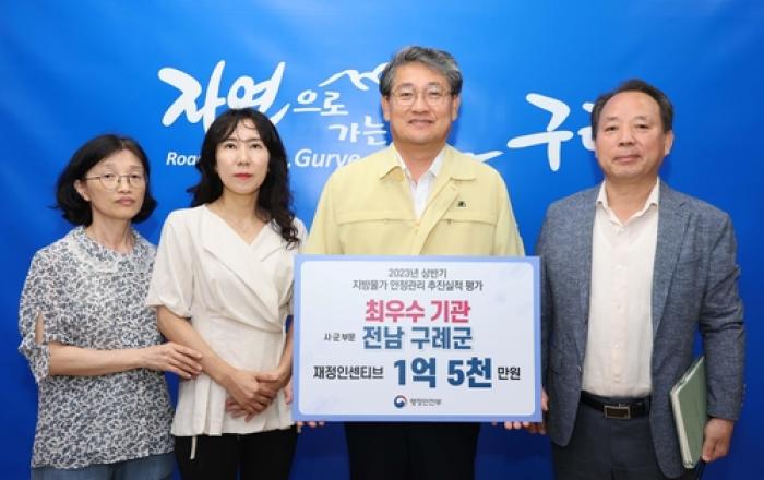 전남 구례군은 지난 12일 행정안전부가 시행한 '2023년 상반기 지방 물가 안정관리 추진실적 평가'에서 시군 부문 최우수 기관에 선정돼 특별교부세 1억 5천만 원을 확보했다고 밝혔다. 행정안전부는 전국 243개 지방자치단체를 대상으로 지방 공공요금 안정관리, 착