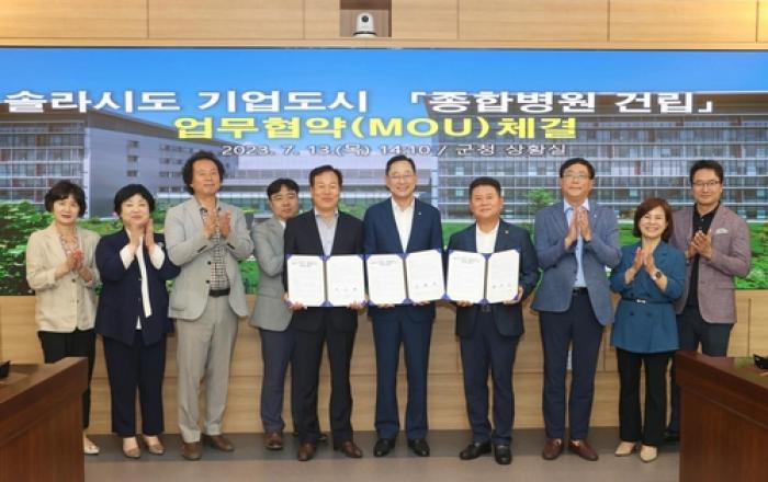 해남군 솔라시도 기업도시에 종합병원이 들어선다. 해남군과 해남우리종합병원, 서남해안기업도시개발㈜은 13일 군청 상황실에서 솔라시도 기업도시 종합병원 건립 업무협약을 체결했다. 해남군청 상황실에서 개최된 업무협약식에는 명현관 해남군수, 김옥민 해남우리종합병원장,
