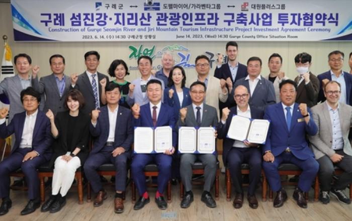 전남 구례군은 지난 14일 도펠마이어/가라벤타그룹, 대원플러스그룹과 '구례 섬진강·지리산 관광인프라 구축사업 투자협약'을 체결했다고 밝혔다. 이날 협약식은 유영광 부군수를 비롯해 도펠마이어/가라벤타그룹 토마스 피츨러 CEO와 대원플러스그룹 최효섭 총괄사장 등 임직원
