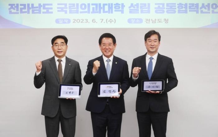 전라남도는 7일 도청 귀빈실에서 국립 목포대·순천대와 함께 도민 의료여건 개선과 지역소멸 위기 극복을 위한 전남도 국립 의과대학 설립에 공동 협력키로 선언했다. 이날 공동 협력 선언에는 김영록 전남도지사, 송하철 목포대학교 총장, 이병운 순천대학교 총장 등이 참석해