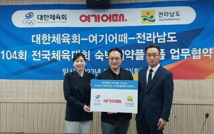 전라남도와 대한체육회는 23일 도청에서 오는 10월 제104회 전국체전 참가를 위해 방문하는 선수단과 관람객의 숙박 편의 증진을 위해 여행 플랫폼인 ‘여기어때’와 업무협약을 했다.전남도는 2008년 이후 15년 만에 전남에서 다시 열리는 이번 전국체전의 성공 개최를 위