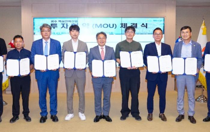 광주광역시(시장 강기정)는 29일 시청 비즈니스룸에서 인공지능(AI)·자동차·에너지 산업 8개 기업과 투자협약(MOU)을 체결했다. 이를 통해 투자금액 593억원, 고용창출 189명 규모의 효과를 거둘 것으로 기대된다.이날 협약식에는 강기정 시장을 비롯해 선석기 광주경