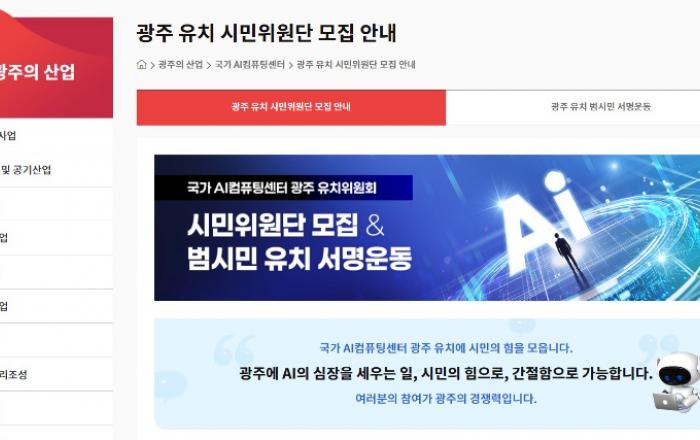 광주시가 국가AI컴퓨팅센터의 광주 유치를 위해 시민들과 함께 힘을 모은다.광주광역시(시장 강기정)는 ‘국가AI컴퓨팅센터 광주 유치 시민위원단’을 공개 모집한다. 이번 모집은 지난 1일 출범한 ‘국가AI컴퓨팅센터 광주 유치위원회’에 이어 전국적으로 유치 열기를 확산하기