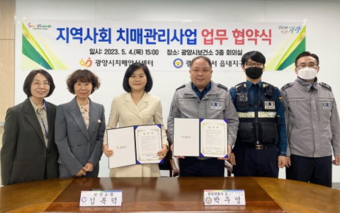 광양시치매안심센터는 지난 4일 광양경찰서 읍내지구대와 효율적인 지역사회 치매 관리사업 추진을 위한 업무 협약(MOU)을 체결했다고 밝혔다. 이번 협약은 치매안심센터에서 치매 예방 홍보, 치매 환자 실종 예방을 위한 사전 지문등록 활성화 등 치매 관리사업을 추진을 위